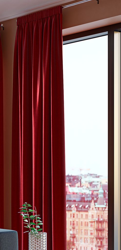 Gardin i fyllig, röd sammet som skapar en varm och festlig julstämning. Den har både kanal och gardinband för flexibla upphängningsalternativ. Gardinen kan kortas av genom att använda det medföljande fållbandet. 1 x B140 x H300 cm