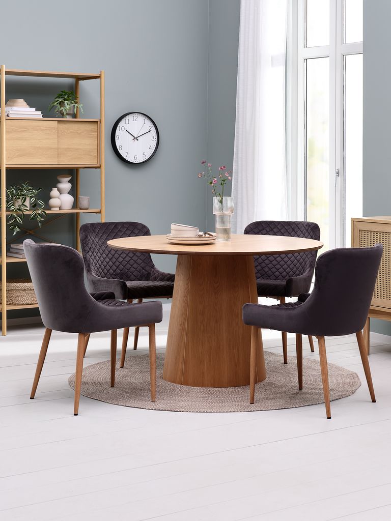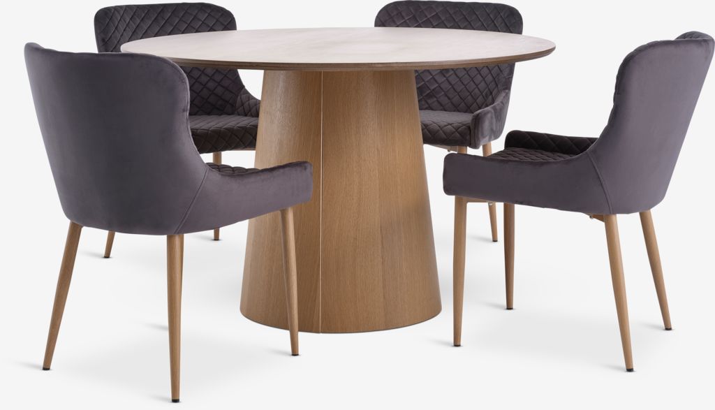 KLIPLEV + PEBRINGEKLIPLEV Ø120 bord natur ek + 4 PEBRINGE stol grå sammet