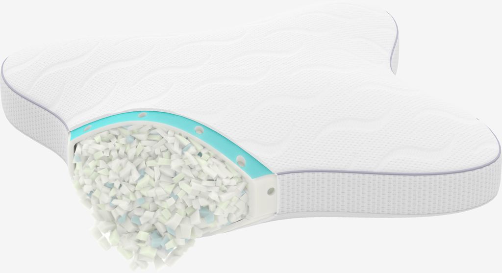 Den unika fjärilsformen ger utmärkt komfort i olika sovställningar. När du ligger på sidan finns det plats för axlarna, och när du ligger på mage kan du ligga med armarna framför dig under kudden och nästan krama kudden.