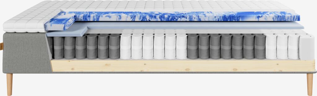 Resårbotten 180x200 cm med pocketfjädrar 246/m², vadderad med Comfort+ skum. Indelad i 5 komfortzoner, som ger ett precist, optimalt stöd. Inkl. 5 cm tjock bäddmadrass med kärna av tryckavlastande gelskum, som anpassar sig efter din kropp och leder bort överskottsvärme. Tvättbart överdrag i 100% polyester (100% återvunnen) med mjuk, tjock quiltning. Exkl. ben.