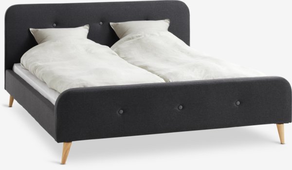 Tygklädsel och massivt trä. Passar till resårbottnar, resår- och skummadrasser 160x200 cm. Exkl. botten och madrasser. B174 x L216 x H101 cm