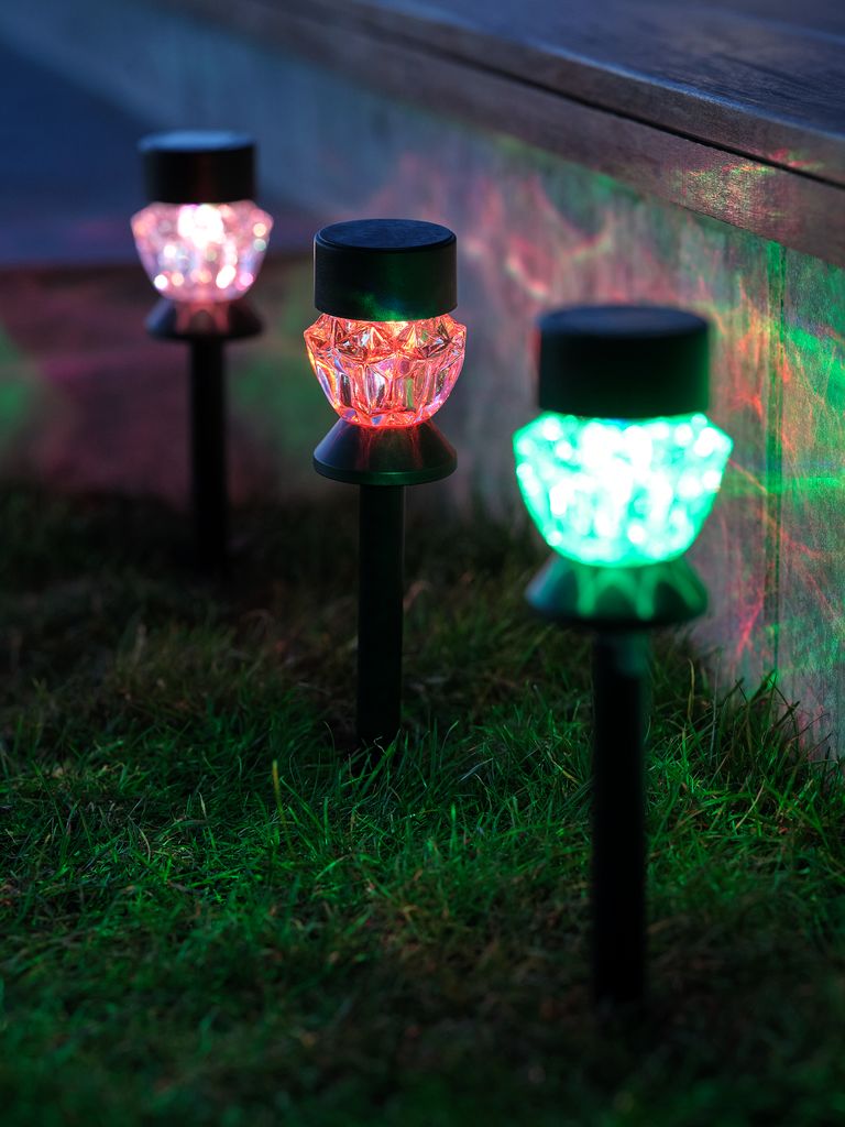 Svart solcellslampa med kristalliknande glas och inbyggd LED. Lampan ger upp till 8 timmars belysning för gångar eller rabatter. Ljuset växlar automatiskt mellan flera färger. Lampan är placerad på ett spjut som enkelt kan sättas ner i marken. Ø7 x H35 cm