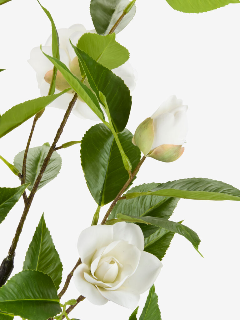 Konstväxt med naturtrogna vita rosor och gröna blad. Denna dekorativa växt kräver inget underhåll och är UV-skyddad för att förhindra att färgerna bleknar. Ø40 x H80 cm
