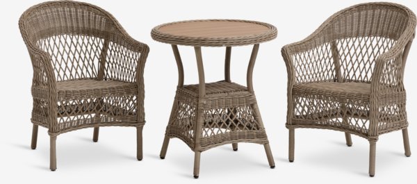 2-sits caféset. Bord: Aluminium, konstrotting och konstträ. Ø70 x H76 cm. Stol: Aluminium och konstrotting. Stapelbar. B67 x H88 x D70 cm