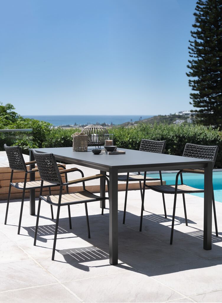 | Material | Ställning: Aluminium, Bordsskiva: DURAWOOD® kompositträ är ett underhållsfritt material med naturlig trälook. Det är tillverkat av en blandning av FSC hårdträfiber och plast, som ger ett slitstarkt och väderbeständigt material. DURAWOOD® är UV-skyddat vilket säkerställer en färgbeständig yta. |