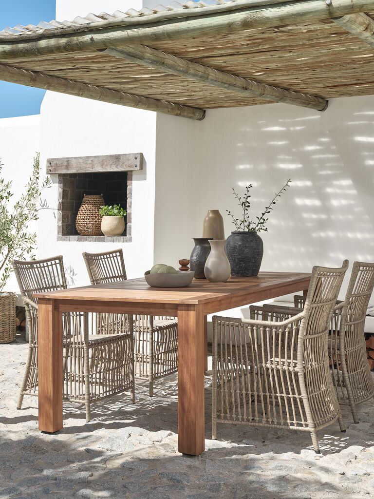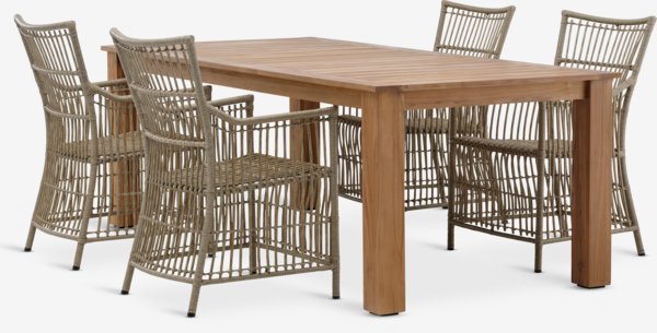 4-sits trädgårdsset. Bord: Massiv FSC® teak. B100 x L210 x H76 cm. Stol: Stål och konstrotting.