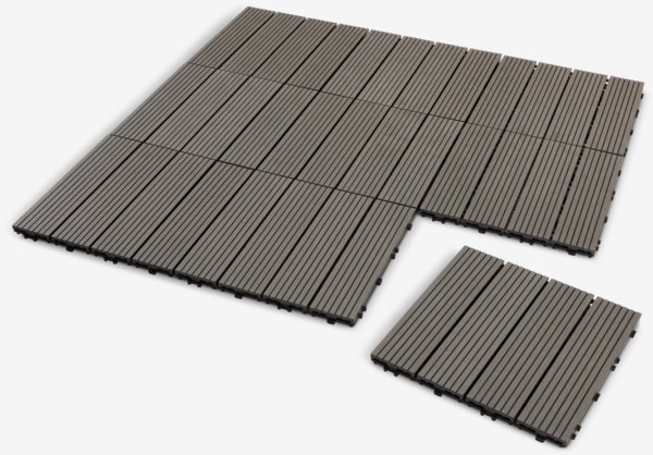 Mörkbruna altanplattor i konstträ med plastbaksida. Dessa plattor är lätta att lägga, så du kan snabbt skapa ett stilfullt och mysigt utomhusgolv på din balkong eller i ditt orangeri. Förpackning med 9 plattor. Varje förpackning täcker 0,81 m². B30 x L30 x H1,7 cm