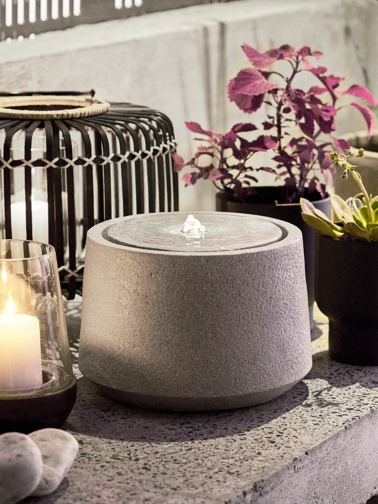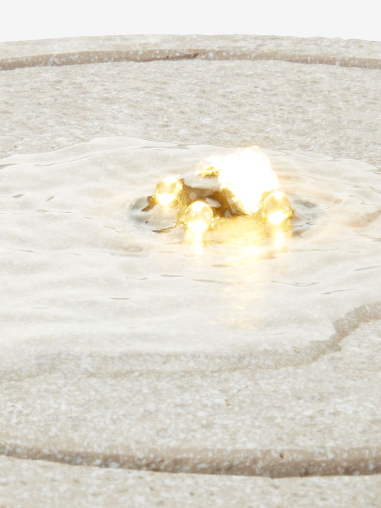 Beige fontän med en enkel, elegant design och inbyggd LED-belysning. Fontänen är gjord av polyresin, ett hållbart och väderbeständigt stenliknande material. Använd fontänen som dekoration på din uteplats eller i trädgården och njut av det rogivande ljudet av rinnande vatten. Inklusive 2,4 m sladd. Ø29 x H21 cm