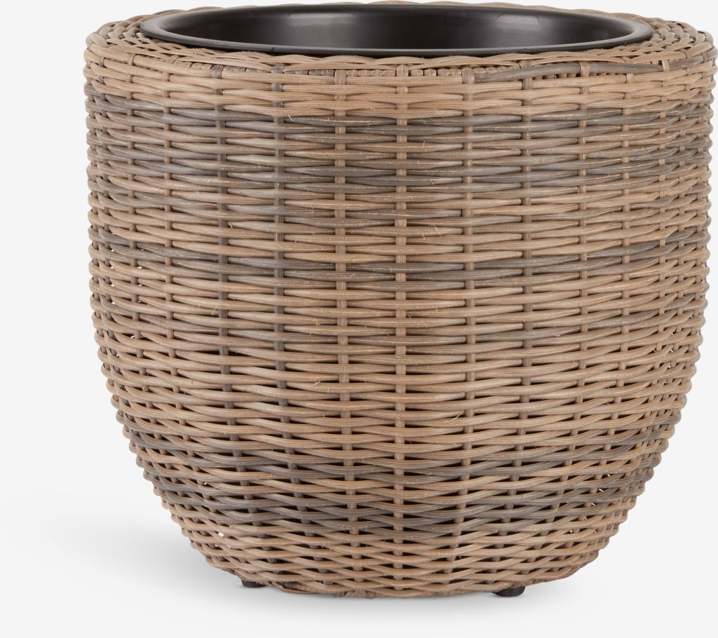 Utekruka tillverkad av konstrotting i naturfärg, plast och stål. Konstrotting ger ett naturligt utseende samtidigt som det är väderbeständigt. Ett dräneringshål kan enkelt göras för att säkerställa att överflödigt vatten kan rinna bort. Denna slitstarka korg smälter sömlöst in i alla inredningar. Ø42 x H36 cm