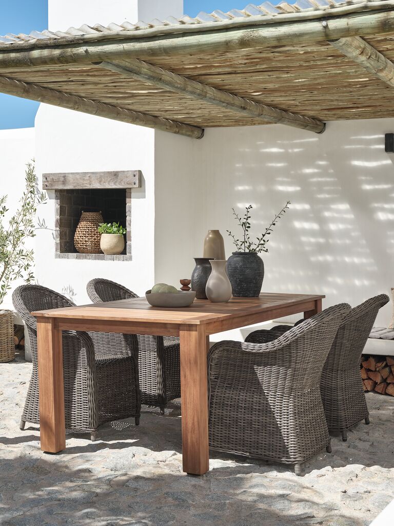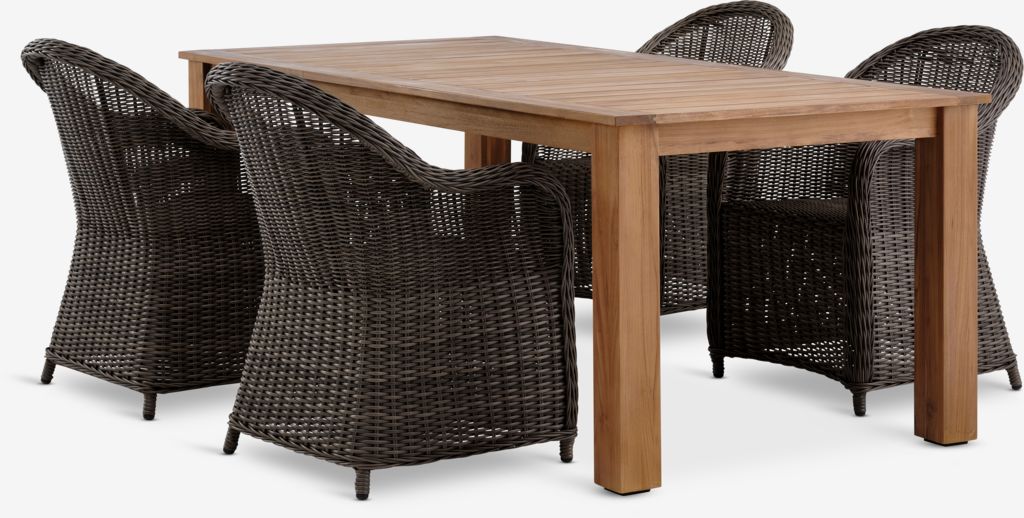 4-sits trädgårdsset. Bord: Massiv FSC® teak. B100 x L210 x H76 cm. Stol: Aluminium och konstrotting.