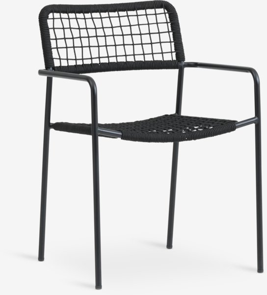 Svart stapelbar stol med sits och ryggstöd i polypropylenrep och stomme i galvaniserat stål. Galvaniseringen hjälper till att skydda stålet mot slitage och rost. Trädgårdsstolen kan staplas för kompakt förvaring.