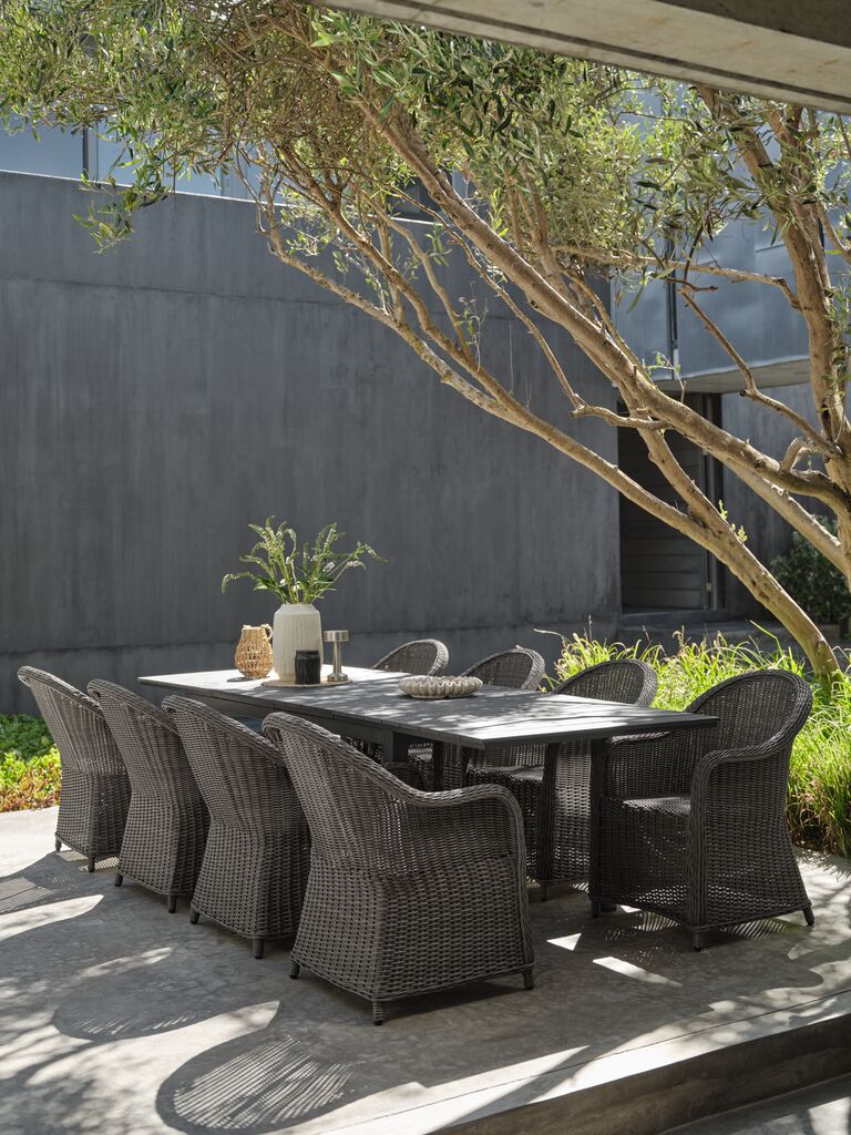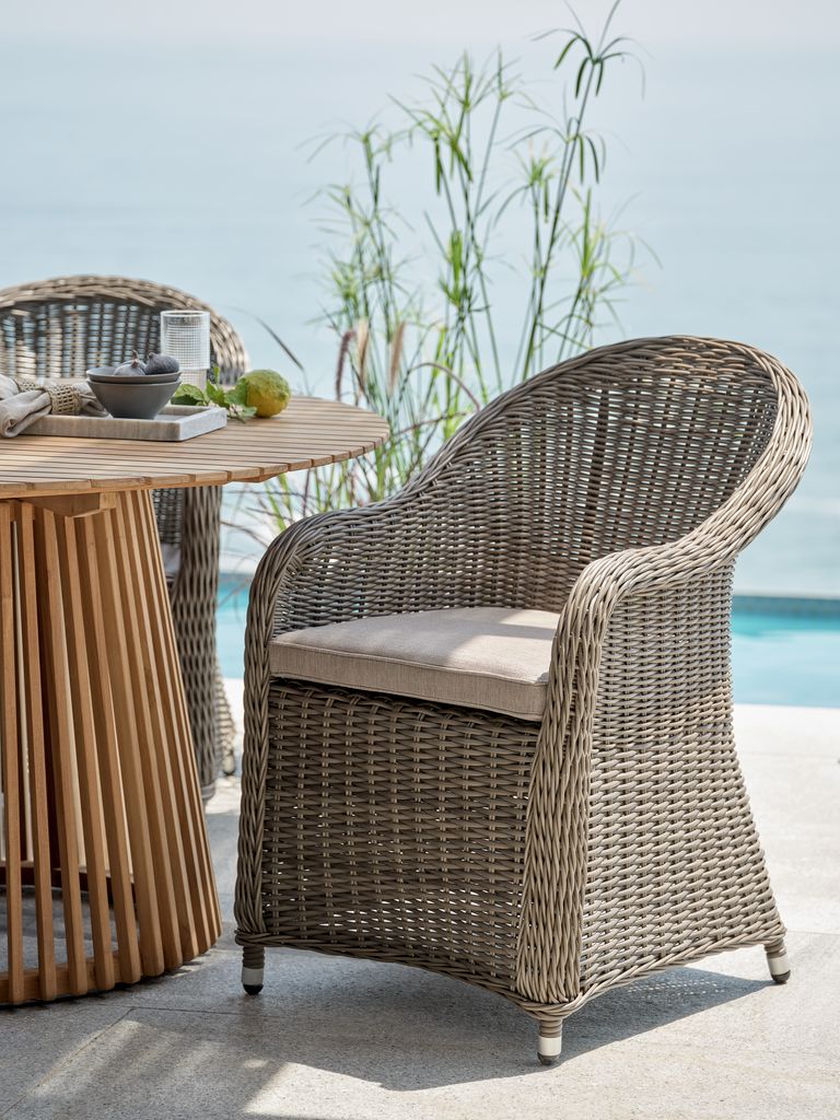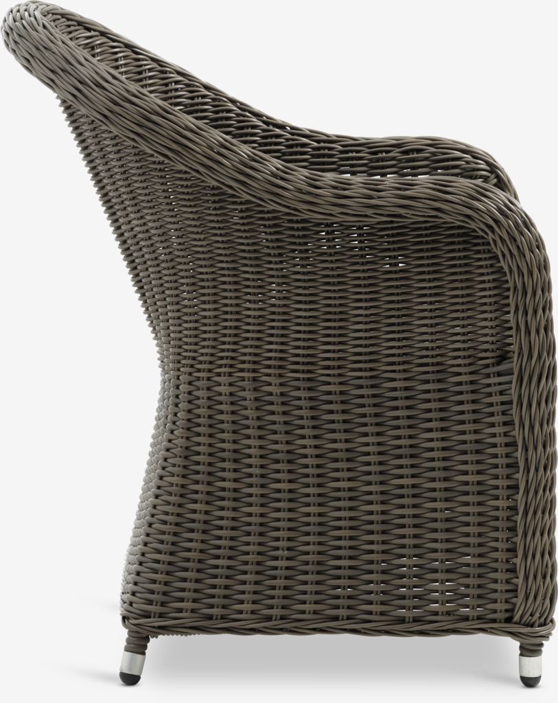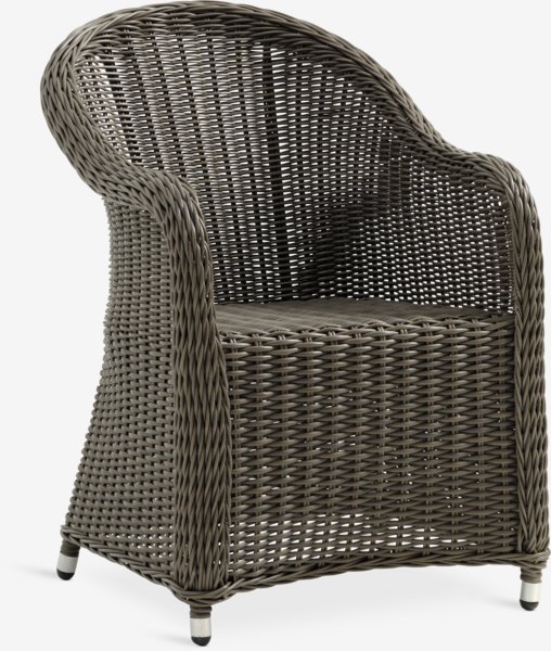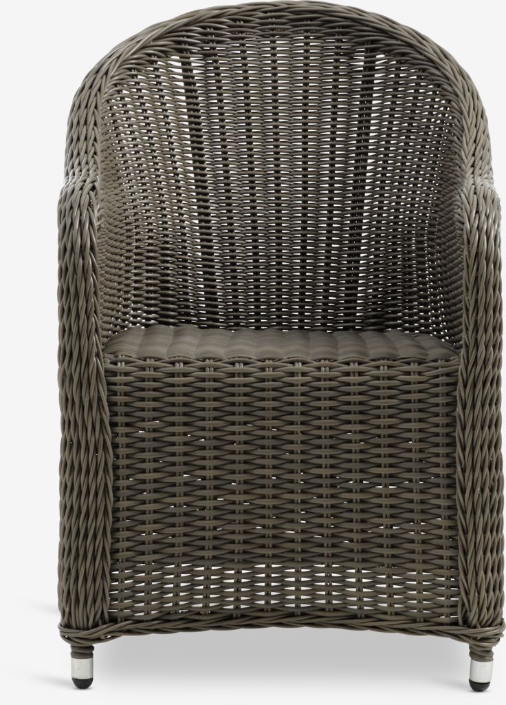 Grå trädgårdsstol i konstrotting med stomme i pulverlackerad aluminium. Konstrotting ger en naturlig flätad look, samtidigt som det är väderbeständigt och underhållsfritt. Aluminium är ett lätt och robust material som inte rostar.