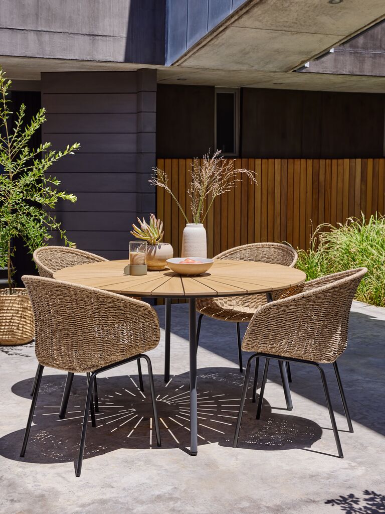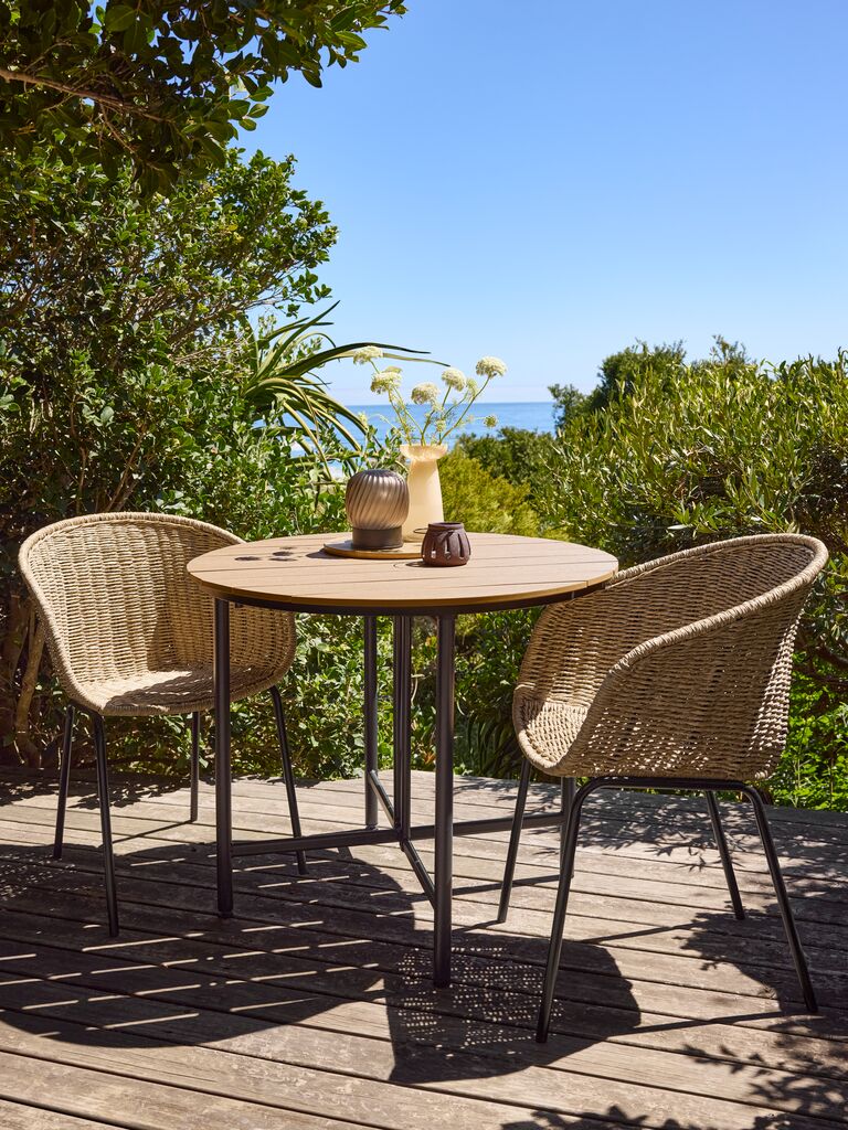 Trädgårdsstol med sits i konstrotting och svarta ben i pulverlackerat stål. Konstrotting ger en naturlig flätad look, samtidigt som det är väderbeständigt och underhållsfritt.