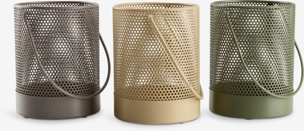 Lykta tillverkad av pulverlackerat stål med en modern, perforerad design. När den är tänd skapar den ett vackert ljusspel. Den kompakta storleken och handtaget gör den lätt att placera i trädgården eller hemma. Finns i osorterade färger och säljs styckvis. Ø8 x H10 cm