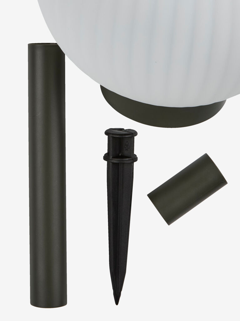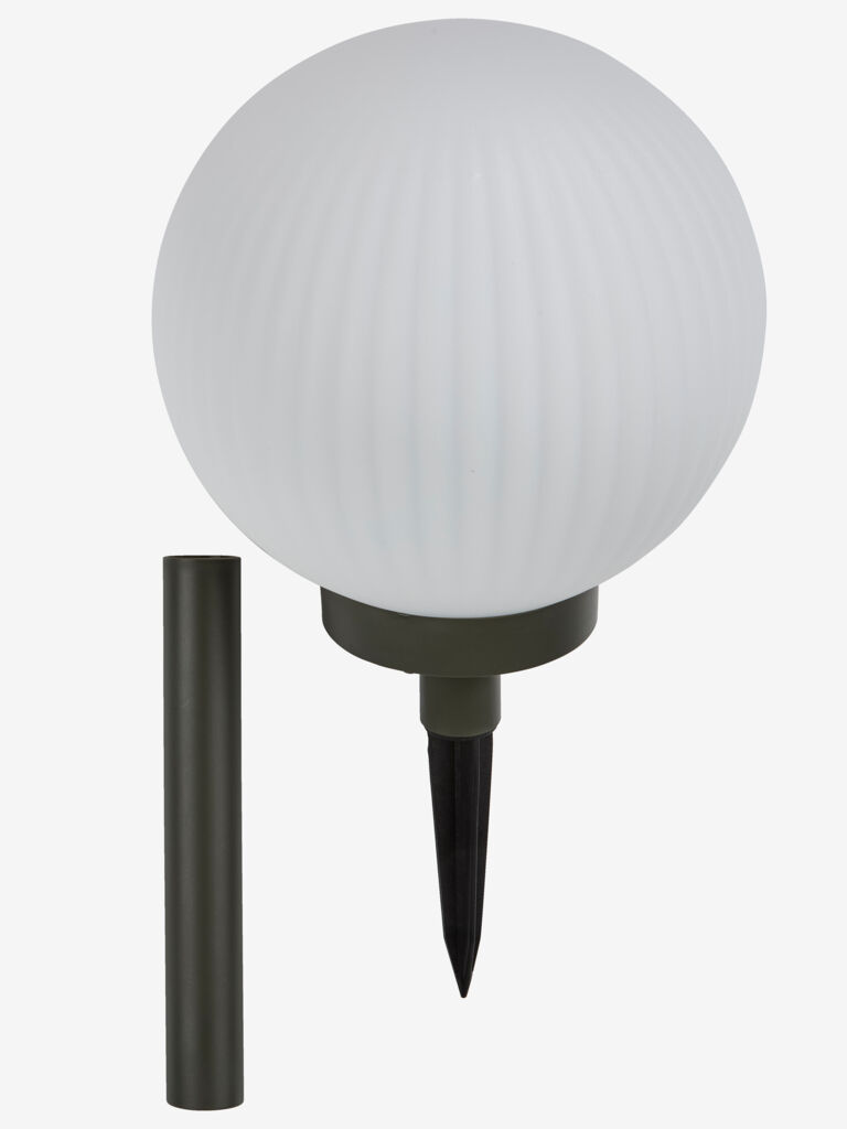 Solcellslampa med en vit, klotformad design som kastar ett mjukt, stämningsfullt ljus. Eftersom den är solcellsdriven är den lätt att placera var som helst i trädgården med hjälp av markspettet. Lampan ger upp till 6 timmars ljus efter skymning och har en justerbar höjd. Ø18 x H33/46 cm