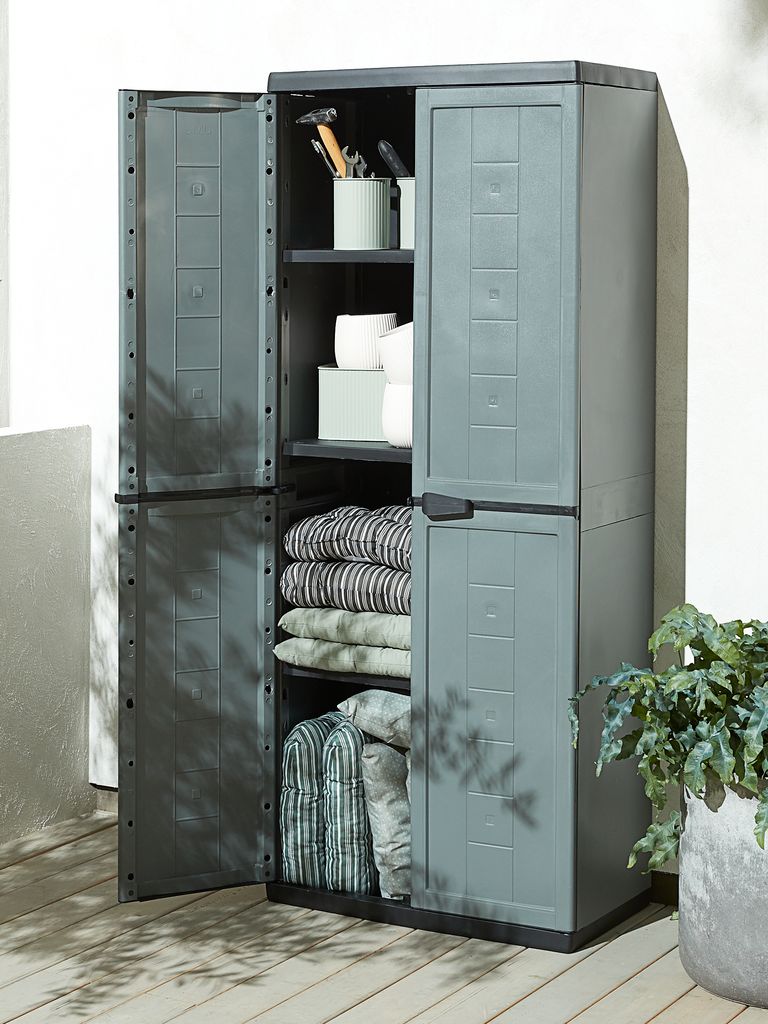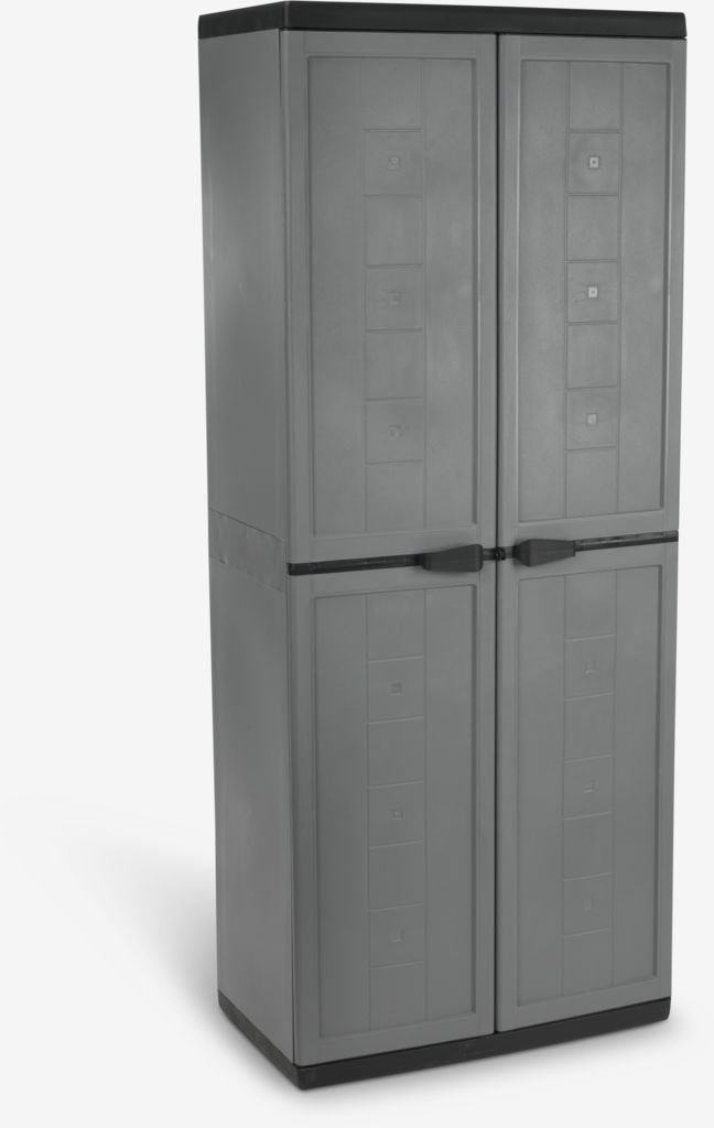 Skåp i UV-skyddad plast (85% återvunnen). Med 3 hyllor. Kan användas till trädgårdsredskap, blomkrukor m m. Frostsäkert. B68 x H166 x D39 cm